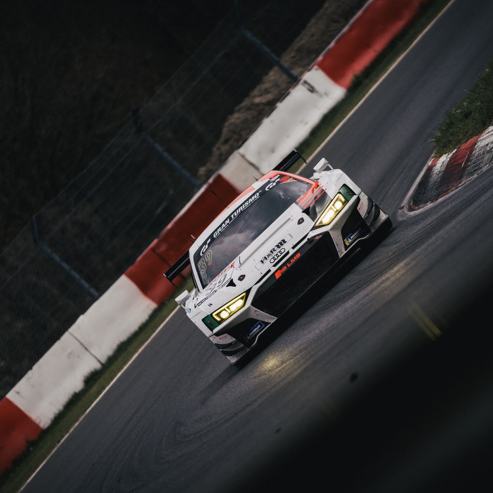 Blasting through the tight corners of the Nordschleife, the #39 Audi R8 LMS by Land Motorsport digs into the apex with razor-sharp focus. The white and red livery contrasts with the shadowed track, emphasizing the surgical precision of GT3 racing.